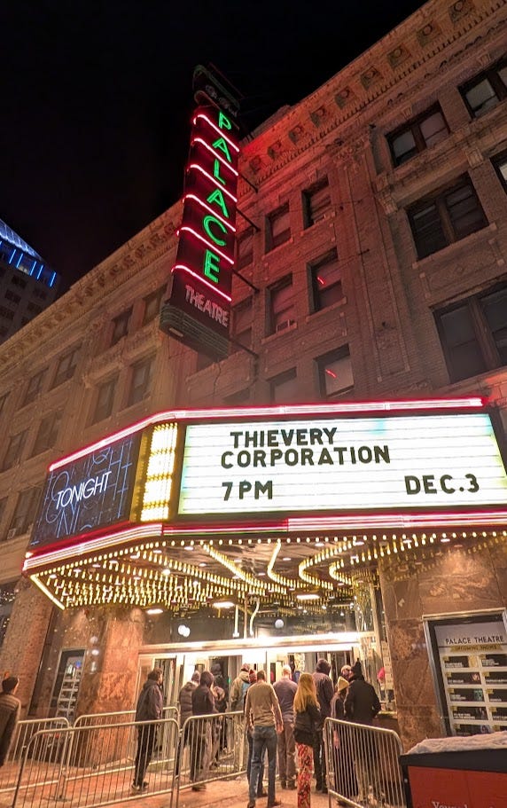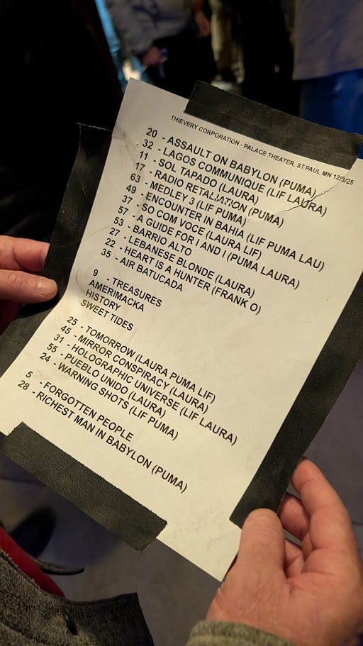 The highlight of the show for me was “The Heart’s A Lonely Hunter”, Thievery’s 2005 collaboration with David Byrne, exactly one month after Byrne played the proper side of the river. Like the other times I’d seen them, they did a handful of songs acoustically mid set for a cool tempo change. It seemed like the sitar was more prominently featured than the other two times I’d seen them, at the Varsity Theatre a couple years ago and at First Ave last September. I was in the loge for the first time ever at the Palace, which gave me the best view possible of the stage. Loge is actually just across the aisle from the normal balcony seats, just a little pricier. It was the somehow the first show I’ve ever seen from any part of the balcony level, despite having seen dozens of shows there since it was renovated by the city and re-opened in 2017. I’d heard the upper levels are fantastic when the venue is sold out, with the designated seats. With plenty of room on the floor and everyone remaining seated upstairs, I spent the last half of the show with the posse on the dancefloor.