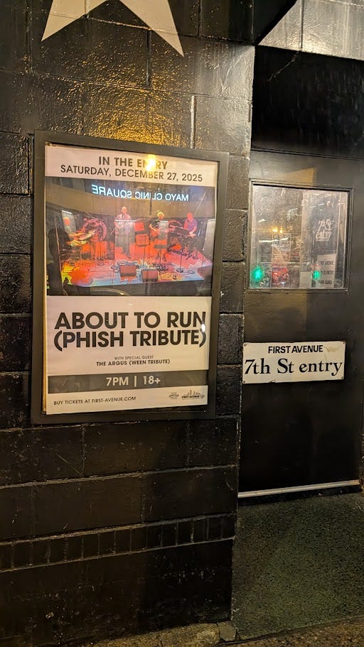 Art Hoffman’ s Phish Tribute band, About To Run, headlined this Saturday after Christmas show, along with guitarist Art Begley, drummer Mark ‘Munchie’ Collins and Berek Awend on keys. The band took on “Runaway Jim” to open, followed by “Run Like An Antelope”. There was a good sized crowd that must have been approaching a sell-out, even for opening band The Argus, a Ween tribute act. The lead guitarist of The Argus joined ATR for a few songs. Some of my favorite Phish songs, “Sand”, “Punch You In The Eye” and “Harry Hood”, were well executed highlights. Happy Birthday, Ryan!